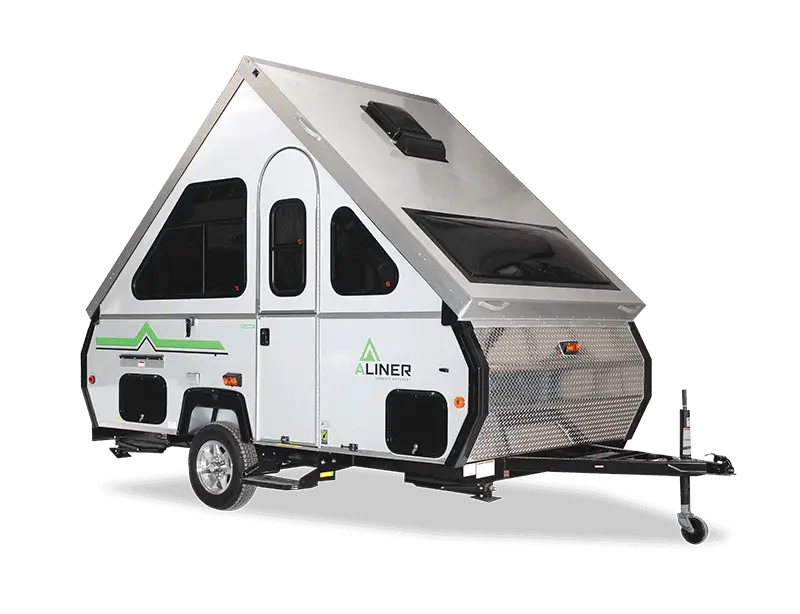 ## ALiner Classic A-frame Permanent Bed highlights - Under-Dinette Storage - Sink - Front Utility Light - Two Burner In/Out Stove - Outside Storage Pack your bags and be on the road in no-time with this lightweight A-frame camper that can sleep four people. You'll enjoy having a 60" x 76" permanent bed with storage underneath for your shoes or bags, and if you have a guest sleep over, they can sleep on the dinette that converts to a 46" x 76" bed. Whip up a hearty lunch on the two burner in/out stove, or use the convenient microwave oven. There is also a3.0 cu. ft. 2-way refrigerator for perishables and additional storage space for dry goods. With any ALiner Classic A-frame folding pop-up camper you will find vacuum bonded fiberglass panels, an E-coated frame with powder coating on the front tongue and bumper, plus Azdel composite for added durability and strength. The additional corner windows provide panoramic views, and the hardwood cabinet doors will give these campers a more at-home feel. Four stabilizer jacks come standard, along with dual propane tanks, an exterior outlet, and an outside shower. You'll love the sleek look of the black and gray exterior package and the LED running lights, plus each model includes diamond plate stone guard for added protection again rock and debris on the way to the campground. It's no wonder these campers are named classic! Choose your model and start camping today!