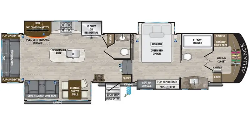 Experience the epitome of luxury and comfort with the 2021 Alliance RV Paradigm 370FB. Designed for those who crave a home-like feel on the road, this RV offers a spacious and elegant living area complete with a 50" class smart TV and a cozy fireplace, perfect for unwinding after a day of adventure. The rear living space is thoughtfully designed with dual recliner love seats and a floating dinette table, providing a perfect blend of relaxation and dining elegance. The kitchen is a chef's dream, featuring a full-size refrigerator, four-burner cooktop, and dishwasher prep, ensuring you have all the conveniences of home while exploring the great outdoors. The front bath layout offers a sanctuary of privacy and luxury with a walk-in closet and washer/dryer prep, making it easy to keep everything organized and fresh. The master bedroom boasts a king-size bed option, promising restful nights under the stars. With a generous 98-gallon fresh water capacity and powered retractable awnings, this RV is perfectly equipped for extended stays. The Paradigm 370FB combines modern amenities with thoughtful design, ensuring every journey is as comfortable as it is memorable. For more details, visit your nearest General RV dealership.