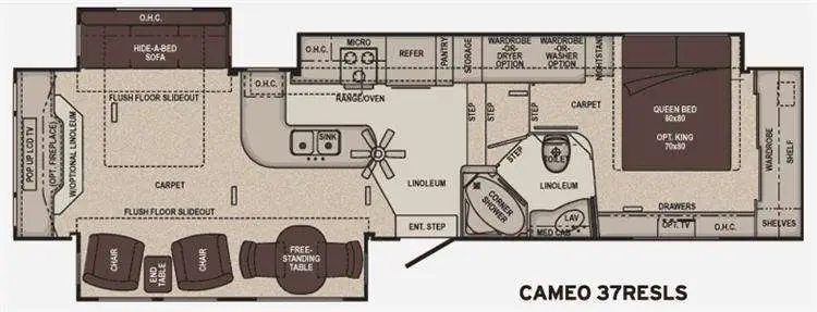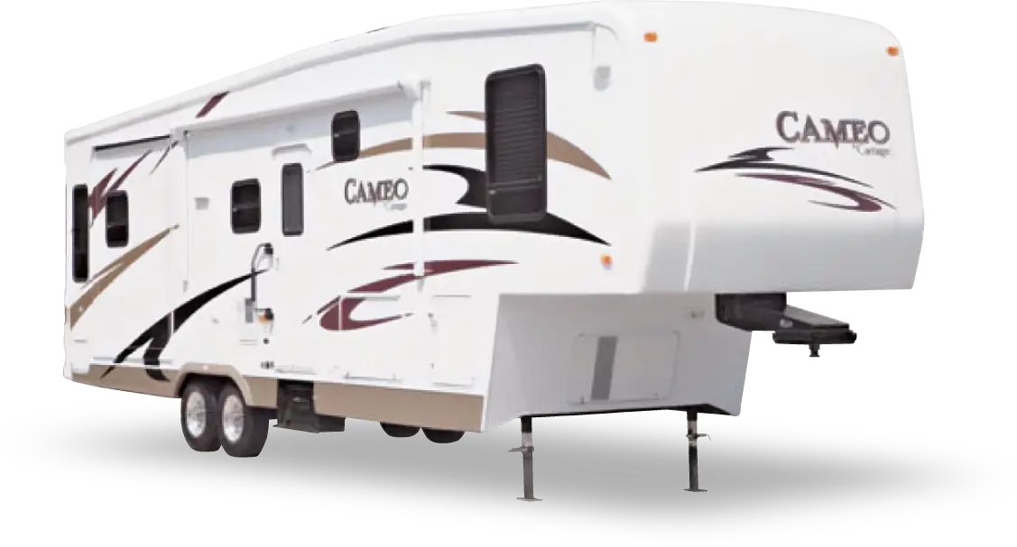 Triple Slide Cameo Fifth Wheel w/Rear Living Area, Hide-A-Sofa w/Overhead Cabinets Slideout, Pop Up LCD TV, 2-Lounge Chairs w/End Table/Free-Standing Table Slideout, L-Shaped Counter w/Double Kitchen Sink, Microwave, 3 Range/Oven/Refrig./Pantry/Storage/Wardrobe/Nightstand/Queen Bed Slideout, Wardrobe w/Shelves, Corner Shelves, Drawers, Overhead Cabinets, Bath w/Corner Shower, Toilet, Lav., Med. Cab., & Much More! Avaiable Options May Include: Fireplace, Washer/Dryer, King Bed, TV.