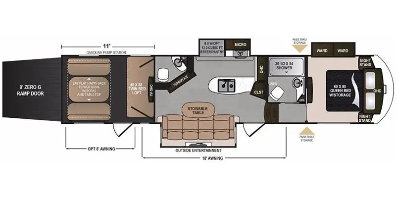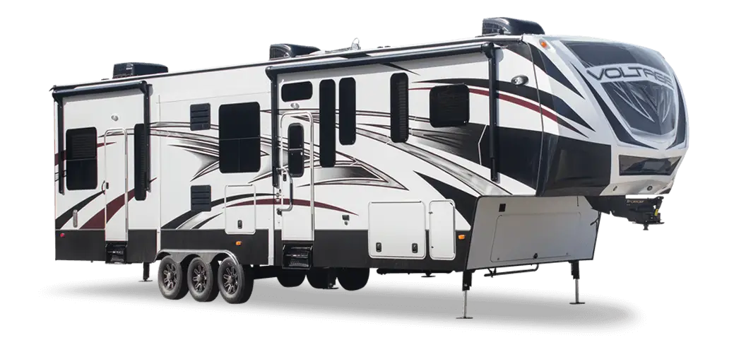 Dutchmen Voltage is one of the most popular toy haulers in the industry. In fact they are so high-quality and well-appointed that many of the people who own them don’t have outdoor toys to go with them! Enjoy tons of extra space that Voltage provides including a ramp that doubles as a rear patio. Other features include a spacious master bedroom, high ceilings, memory foam mattress, and gourmet kitchen.