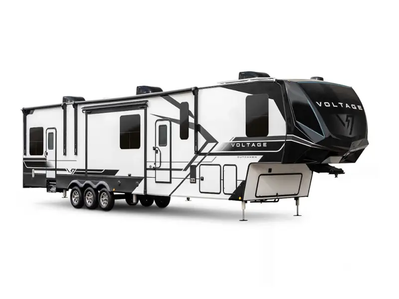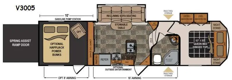 Enjoy this Voltage V-Series unit V3005 when you head out for a weekend filled with fun! In this toy hauler fifth wheel you will enjoy a 10' garage area and dual slides in the front living space which features everything you need and more while traveling away from home. Step inside the garage using the rear ramp or side man door. Loading is made easy into the 10' garage space and there are several tie downs to secure your load. Choose the optional Happi-Jack power bunks for added sleeping space when the toys are removed. There are overhead cabinets the entire width of the unit just before you head through the glass patio doors into the main living space. Once inside notice the large slide out reclining sofa seating lounge with stowable table. There is a corner storage cabinet just before the steps that lead up to the front master bedroom and bath. The kitchen offers a spacious area to prepare and cook food for your hungry crew. There is a pantry for dry good storage, a refrigerator, three burner range with 21" oven, and counter area with double kitchen sink. Plus, there is plenty of overhead storage for all of your dishes and things. Just inside the main entrance there is a corner entertainment center for your enjoyment with an LED TV. Step up to a side aisle bath featuring a neo-angle shower, toilet and sink with overhead cabinet. Continue on to the front private bedroom with a queen hinged top bed with nightstands on either side, plus overhead storage. There is also a his and her slide out wardrobe both featuring double door entry, plus so much more! On the exterior there is a gasoline pump station and pass-through storage compartment in the center.