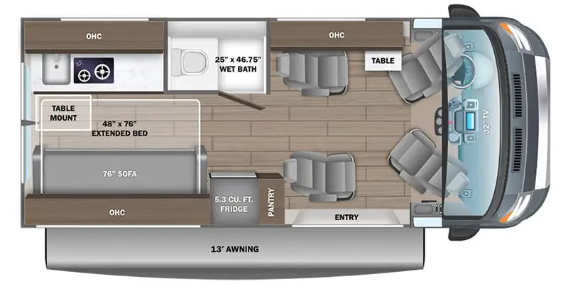 Entegra Coach Ethos Class B gas motorhome 20A highlights: Two Additional Cab Seats Sofa Pantry Convection Microwave 13' Thule Armless Awning Enjoy day trips with friends or overnight stays at your favorite campground with your honey in this cozy motorhome. You will find swivel captain seats, plus two additional cab bucket seats for ride-along friends. The sofa in the back can convert to a 48" x 76" extended bed when you need a rest, and there is a TV to watch a movie. The kitchen is equipped with everything you need to prepare meals each day, including a stainless steel sink, a convection microwave, and a 5.3 AC/DC refrigerator for perishables. This model includes a convenient wet bath with a medicine cabinet with a mirror, a powered roof vent, plus an Aqua View Showermiser water management system you are sure to appreciate. The optional Li Package can also be added which includes a 48V-210 amp hour smart lithium battery, providing 10KW hours of power, and more- see dealer for more details! With any Ethos Class B gas motorhome by Entegra you will find helpful technology features, luxury amenities, and a smooth drive thanks to the E-Z Drive system. The 3.6L V6 24V VVT 276HP engine will power your trips near and far, plus there is an Onan 2800-watt gas generator on board and a 1,000-watt inverter. Put the 200W solar panel to use and you can do a little off-grid camping! Each model also includes a Truma Combi Eco Plus water heater and furnace, a 13,500 BTU A/C, a water filtration system, plus many more convenient systems. A 10" Uconnect infotainment center comes standard, along with a backup camera and a cab area privacy shade. You'll be traveling in luxury with residential vinyl flooring, Technoform European-style high-gloss cabinetry, a soft-touch vinyl celling, and solid surface countertops. Start a new adventure today in an Ethos Class B gas motorhome today!