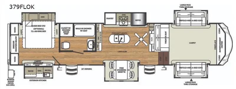 **Forest River Sandpiper fifth wheel 379FLOK highlights:** - Front Entertainment Center - Rear Bedroom - Six Slide Outs - Two Entry Doors - Exterior Kitchen Get ready to camp in comfort when you choose to camp in this Sandpiper 379FLOK fifth wheel by Forest River. This model features sleeping space for up to six people with a rear queen bed and two tri-fold hide-a-bed sofas in the front living area. Along the front of this unit there is an entertainment center where you can watch a TV or a movie. With two entry doors you can easily enter this unit and be in the kitchen area or you can enter through the rear door and have easy access to the bathroom. The exterior kitchen is ideal for storing drinks or snacks. Here you will also find a sink and a microwave. When you choose to camp with a Sandpiper fifth wheel by Forest River you are choosing a quality built fifth wheel with plenty of features and comforts to go around. Along the exterior there are large tinted windows, a "One Touch" Dometic electric awning with an LED light strip, 2 LED lighted exterior speakers, plus a docking station for easy winterization, hot and cold spray port, black tank flush, and pull valves for the tanks. Inside there is Beauflor rustic wood plank linoleum, a decorative backsplash, a 40" flat screen LED HDTV, plus a 9 cu. ft. stainless refrigerator. You can also choose from a few optional packages such as the Polar Tech Package, the Premium Package Plus which is offered for a limited time, and the Sandpiper Signature Package.