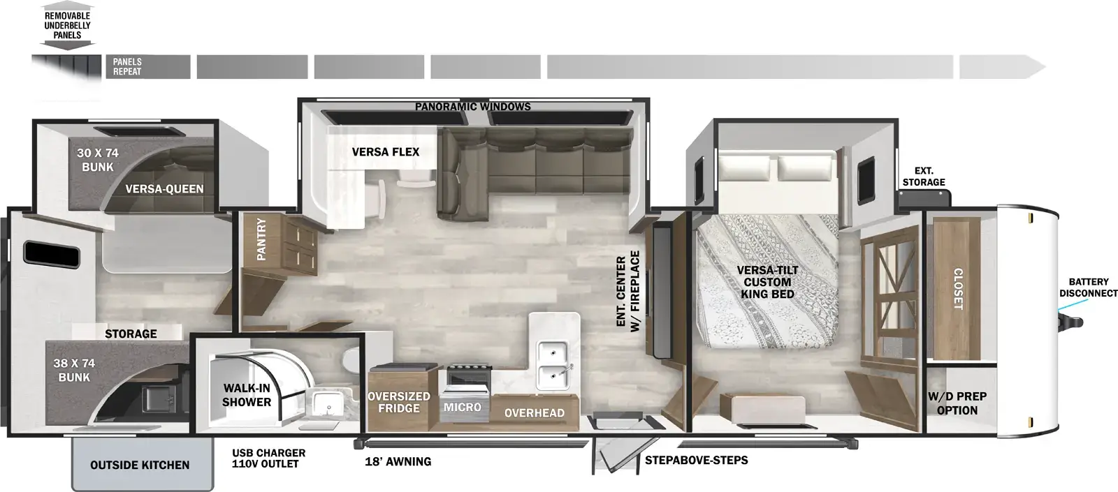 ## Forest River Wildwood travel trailer 33TS highlights - Private Bunkhouse - Versa Queen Bed - Custom King Bed with Versa-Tilt - Panoramic Windows - Outside Kitchen Have you been searching for the perfect travel trailer for your family? This Wildwood might just be the RV you have been looking for. Just imagine hiking, biking and playing horse shoes at your favorite campground to return to plenty of space for everything thanks to the triple slides, one in each room. The kiddos will surely head to the rear private bunkhouse to claim a bunk bed while you take a nap on the custom king bed in the front bedroom. You can then make dinner on the outside kitchen or in the full kitchen inside. Everyone can play games or relax on theVersa Loungebefore heading outside to see the stars. Check it out! Enjoy years and years of memories with any one of these Forest River Wildwood travel trailers! They are built with a Dicor PVC roof membrane, a powder coated I-beam frame, and an aerodynamic front radius profile for an easier tow. The triple seal slide out system prevents water from seeping inside and keeps it outside where it belongs. The Best In Class Value Package includes upgraded designer furniture, seamless countertops with no T-mold, and two zone residential soundbars with FM, Bluetooth, HDMI and USB. You will also appreciate the heated and enclosed Accessi-Belly with removable underbelly panels, the power tongue jack with an LED light, and the designated CPAP storage. Some new upgraded features include: an upgraded slide-out fascia, a Versa-Tilt bed, an upgraded shower head, and a 60K BTU tankless water heater, and so much more!