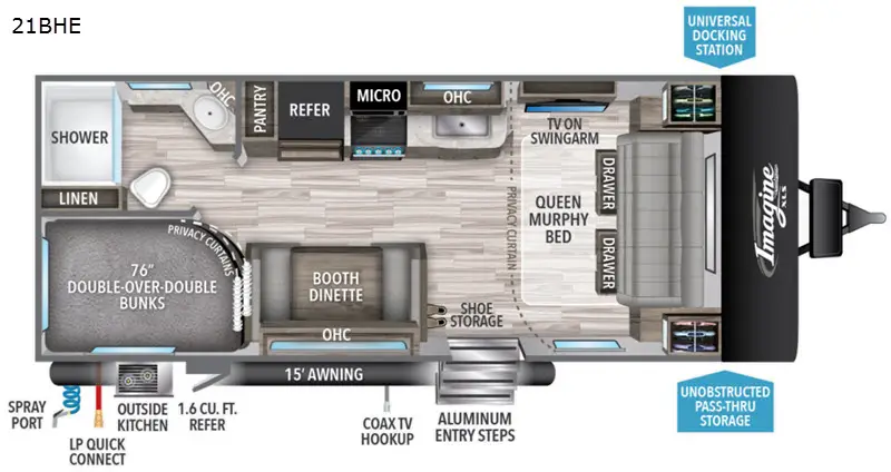 Grand Design Imagine XLS travel trailer 21BHE highlights: Outside Kitchen Double-Size Bunks Queen Murphy Bed Booth Dinette Wardrobe Cubby Storage Unobstructed Pass-Through Load up your tow vehicle and head out with your family of six to seven to enjoy the great outdoors with inside comforts only a few steps away! You can make meals using the outdoor kitchen and store extra beverages in the 1.6 cu. ft. refrigerator, relax under the electric awning, and place your outdoor gear in the pass-through compartment. When you are inside, relax and dine at the booth dinette which also offers extra sleeping space, and make full meals using the kitchen amenities including a double door refrigerator and stainless steel sink. The pantry can be the go-to for the snacks. The kids will love the double-size bunks with privacy curtains when it is time to sleep, and you will enjoy your own queen Murphy bed that can be easily set up after enjoying the sofa. You will have your own privacy curtain as well. Today's medium duty trucks and SUV's can tow one of these Grand Design Imagine XLS travel trailers or toy hauler! With the 4-Seasons Protection package, you will find maximum insulation, heating power, and function with an EvenFlow heating system without vents in the floor to collect dirt and debris. You can also control your unit at the touch of a finger with the Compass Connect system. They have been constructed to a superior standard with features like a roof mounted solar prep, a power tongue jack, a ducted low profile A/C, and a marine grade telescoping dinette pedestal. Walk around freely with 78" maximum headroom, and check out what else these units have to offer!