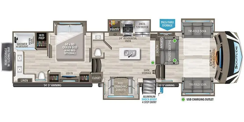 Five slide outs, a full bathroom with dual sinks, a half bath off of the kitchen, and a separate front living room and entertainment area are a few reasons you will enjoy your time spent in this fifth wheel! The separate kitchen is a dream with stainless steel appliances including a 24" residential oven, a pantry and hutch with counter space, a kitchen island plus a free-standing dinette slide with windows for great views. The entertainment center offers an LED Smart TV with a fireplace below and storage, and the dual opposing tri-fold sofas provide added sleeping space at night. The master bedroom includes a queen bed, LED TV and storage, plus space savings sliding doors that lead you to the rear full bathroom with dual sinks, linen storage, and washer/dryer prep. You will find more storage throughout the fifth wheel in the overhead cabinets, the entry closet, and even your shoes have a spot under the interior steps leading to the front living/entertainment room. The exterior has several storage choices as well including a pass-through compartment for fishing poles and such, plus the unique sliding tray in the rear allows you to bring along larger items such as camping tables, portable grills, golf clubs, totes and more. Each Solitude fifth wheel by Grand Design features a 101" wide-body construction, heavy duty 7,000 lb. axles, frameless tinted windows, and high-gloss gel coat sidewalls. You can camp year around thanks to the Weather-Tek Package that includes a 35K BTU high-capacity furnace, an all-in-one enclosed and heated utility center, and a fully enclosed underbelly with heated tanks and storage. Inside, you'll love the premium roller shades, hardwood cabinet doors, solid surface countertops and sinks, plus residential finishes throughout to make you truly feel at home. Each model also includes a MORryde CRE3000 suspension system, self adjusting brakes, and a MORryde pin box that will provide smooth towing from home to campground. Affordable luxury is possible with the Solitude fifth wheels; choose yours today!