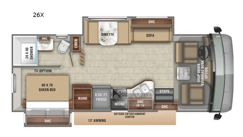 Jayco Alante Class A gas motorhome 26X highlights: Rear Bath 6-Way Power Driver Seat Large Kitchen Stainless Steel Sink Wardrobe Two Slides Outside Entertainment If you have been searching for luxury and comfort, then imagine yourself enjoying this Alante Class A gas motorhome on every trip. You will find plenty of floor space thanks to the two slide outs allowing you to move around the coach with ease. The comfortable Jayco-exclusive legless dinette table and sofa provide seating as well as extra sleeping space when the kids or grandkids tag along. The walk-around queen bed gives you a place to unwind after a fun day of exploring or shopping, and you can even pull the curtain closed for privacy. The outside entertainment center with an LED TV mounted on a swivel bracket, the DVD/AM/FM radio and speakers, and the electric awning offer an additional entertaining area outdoors. The Alante Class A gas motorhome comes equipped with a JRide package that includes a computer-balanced driveshaft, jounce bumpers, front and rear stabilizer bars, and SACHS shocks. You will appreciate having the industry's largest travel-view window on the entrance door providing amazing views and extra natural light. Inside, you will find high-intensity recessed LED ceiling lights, ball-bearing drawer guides, and hardwood cabinetry. Plus, the Soundstream Infotainment dash radio with GPS and CD/DVD player will enhance all of your upcoming road trips. Your home on the road is waiting for you, so choose your favorite Alante and get to it!