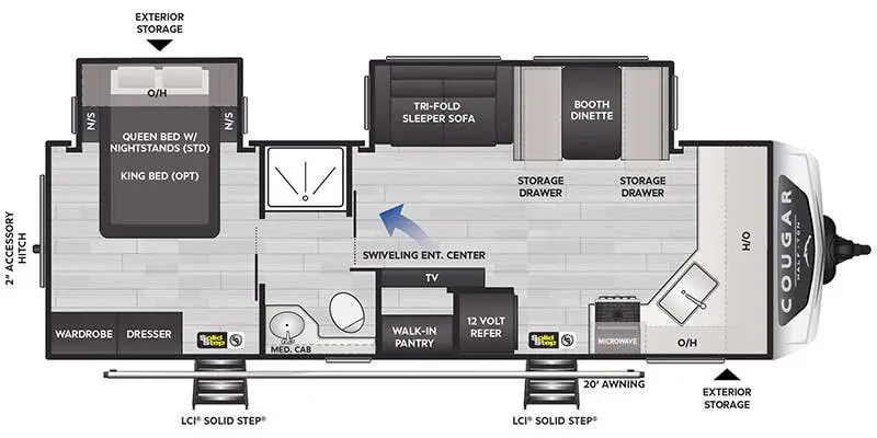 Experience the perfect blend of comfort and adventure with the 2025 Keystone Cougar Half-Ton 25FKD. This RV is designed to cater to all your travel needs with its spacious layout and modern amenities. Imagine cooking up a storm in the front kitchen, equipped with a full-size refrigerator and a three-burner cooktop, making meal prep a breeze. The swiveling entertainment center ensures you can enjoy your favorite shows from the cozy tri-fold sleeper sofa or the booth dinette, both of which convert into additional sleeping spaces for guests. Retreat to the rear bedroom, where you have the option of a queen or king bed, offering a restful night's sleep after a day of exploring. The clever design includes a walk-in pantry and ample storage, ensuring you have all the space you need for your essentials. With a 20 ft. powered retractable awning, you can extend your living area outdoors, perfect for enjoying the fresh air. Despite its compact size, the Cougar 25FKD doesn’t compromise on comfort, making it an ideal choice for families or couples looking to hit the road in style. For more details, visit your nearest General RV dealership.