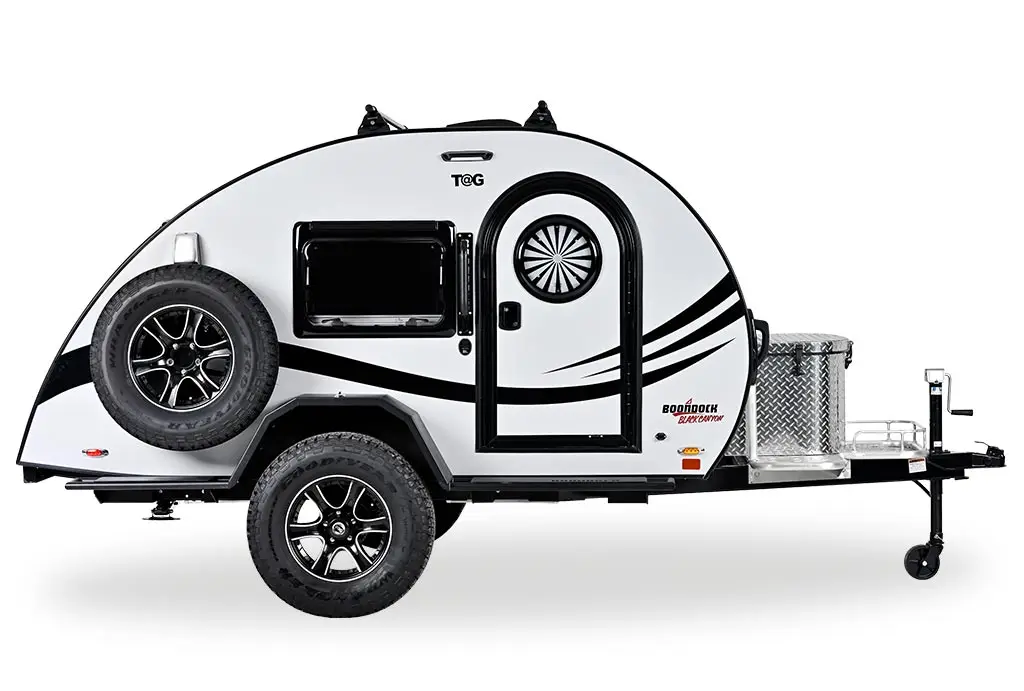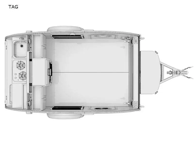 Have fun touring the country or exploring the local wilderness with your significant other and this TAG teardrop trailer! This unit may be compact, but it is also both classy and functional with its modern and updated features, like the hatchback outdoor kitchen that comes with a two-burner stove, deep sink with 10" faucet, and YETI cooler. Spend your days soaking up the outdoors and your nights snuggling up on the 58" x 78" queen-size bed where you can stargaze until you drift off to sleep. Adding the optional Boondock package will make your off-road adventures a little easier and give you a dry hitch weight of 156 lbs. and total dry weight of 1415 lbs. The Boondock package will also create a slightly wider and taller unit by adding 3" to the width, and 5" to the exterior height. Because the nuCamp RV TAG teardrop trailer is super lightweight and easy to hook up, it is always ready for adventure! The TAG is the ultimate two-person getaway unit that provides you with convenience and comfort so that you can be free to see the world. As you prepare for bed each evening, you'll be able to look up at the night sky and admire its beauty through the stargazer window, and you won't have to worry about getting too hot throughout the night because the three-speed Fan-Tastic fan will keep you cool. If you find yourself camping out during the hottest part of summer, you may even need to switch on the air conditioning unit to keep cool. For those who like to make their adventures a little bit more hard core, the optional Boondock package comes with features like aggressive off-road tires, a Yakima roof rack, and an aluminum utility platform plus more. You will certainly want to check it out!