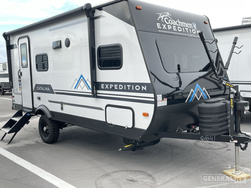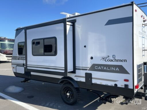 Step towards the rear, and you'll discover a spacious bathroom complete with a shower and curtain, providing a private sanctuary for freshening up. Outside, the 13-foot powered retractable awning creates an inviting outdoor living space, perfect for enjoying the great outdoors while being shielded from the elements. With features like all-terrain tires and a 1000W power inverter, this RV is ready for off-the-beaten-path adventures. Plus, the pass-thru storage and bicycle carrier ensure you can bring along all your gear. For more details and to experience the charm of the Catalina Expedition 192FQS in person, visit your nearest General RV dealership.