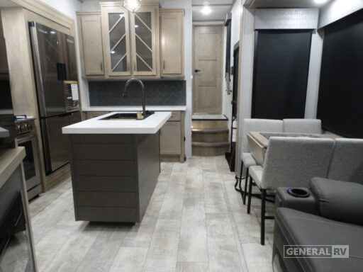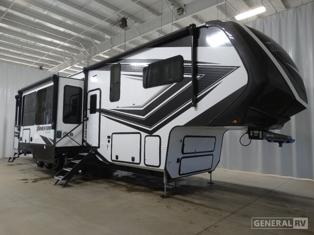 The Momentum 397TH comfortably sleeps up to nine, with a king-sized bed in the front bedroom, a queen bed, and a convertible sleeping area. The washer and dryer ensure you have all the conveniences of home while on the road. The RV's three slides expand the living space, and the three powered awnings provide ample shade for outdoor relaxation. With a robust fresh water capacity of 140 gallons and a 60-gallon fuel tank, you’re equipped for extended journeys. Visit your nearest General RV dealership to experience the Momentum 397TH and elevate your travel lifestyle.