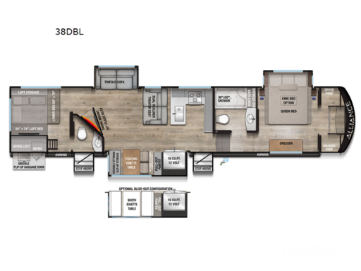 Experience the ultimate in luxury and versatility with the 2025 Alliance RV Avenue 38DBL. This fifth wheel is thoughtfully designed to accommodate up to 10 sleepers, making it perfect for family adventures or group getaways. The spacious interior features a center kitchen equipped with a full-size electric refrigerator and a three-burner cooktop, ensuring you can whip up delicious meals on the road. The floating dinette table offers a flexible dining space, while the center living area provides a cozy setting to unwind, complete with a tri-fold sofa for extra sleeping space.