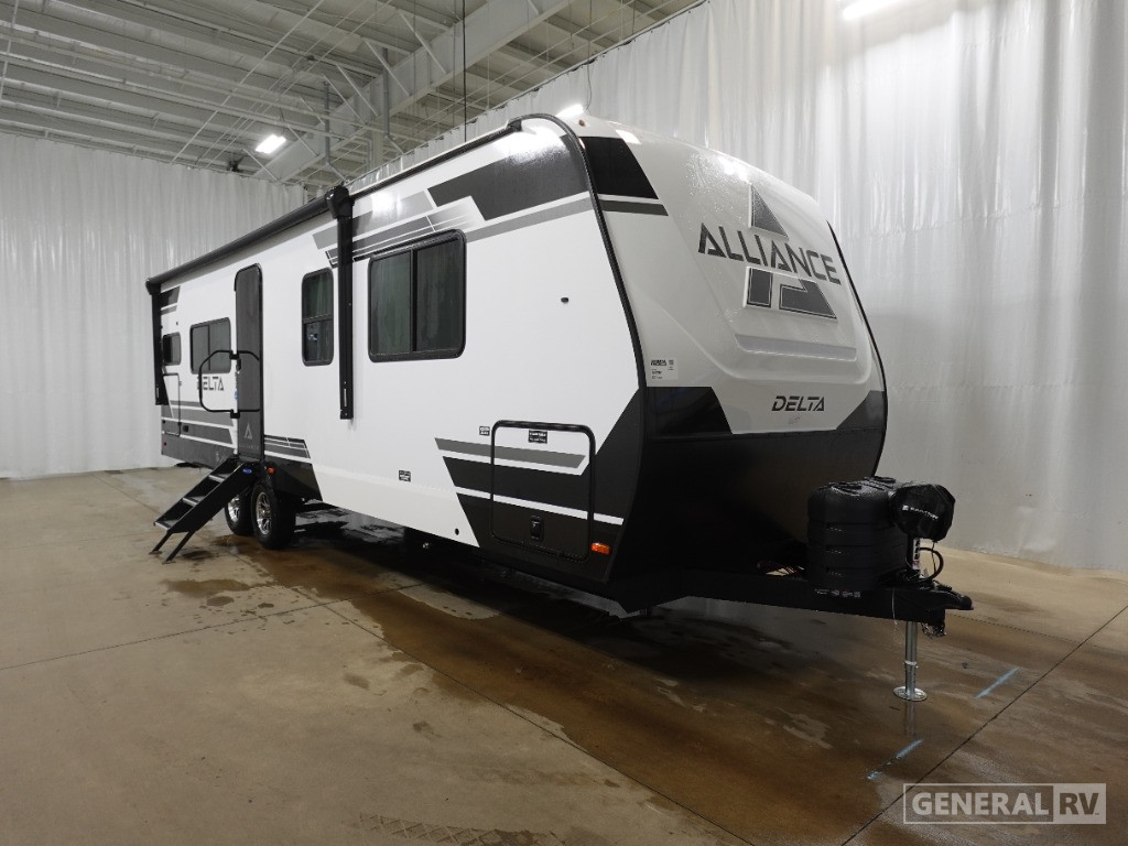 Discover the 2025 Alliance RV Delta 274RKW, a thoughtfully designed travel trailer that brings residential comfort to your outdoor adventures. This rear-kitchen model offers an exceptional layout perfect for couples or small families who appreciate both functionality and style. The innovative rear kitchen design provides wraparound counter space and modern amenities, creating a chef-friendly environment on wheels. The spacious living area features a comfortable theater seat and entertainment center with a 40" TV, making it ideal for relaxing evenings after exploring new destinations.
