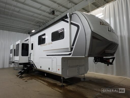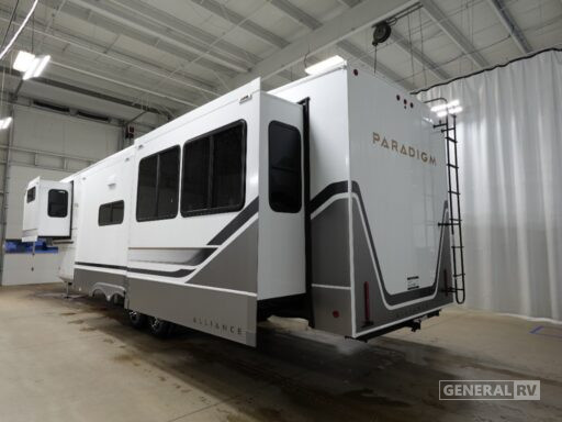 Retreat to the front bedroom, where comfort reigns supreme with a king bed option and plenty of storage space. The front bath is conveniently located, offering a refreshing shower experience with its plastic and glass enclosure. With a washer and dryer prep, extended adventures are a breeze, and the powered retractable awnings create the perfect outdoor oasis. Measuring just over 41 feet, this RV is designed for those who seek both adventure and luxury. Visit your nearest General RV dealership to explore the Paradigm 375RD and start your next journey in style.