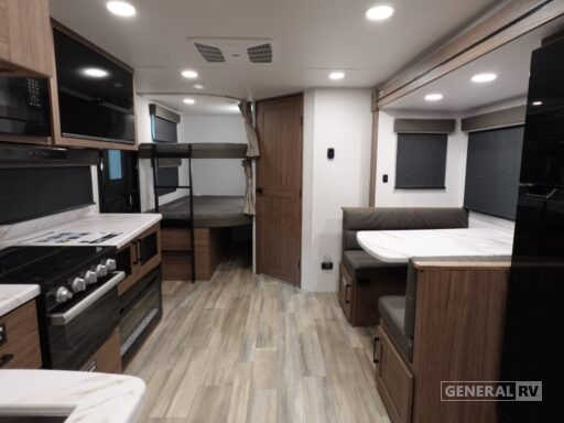 If you're looking for a trailer that can sleep more campers, this is the one! There are 46" x 74" bunks in the back right beside the full bath for easy nighttime use. You'll have your own bedroom up front, complete with a queen bed, dual wardrobe nightstands, and overhead storage. The large slide out in the main living area will provide your crew with plenty of space to dine at the booth dinette or just relax in front of the fireplace. There is a full kitchen inside, along with an exterior griddle/grill when you want to cook outdoors!