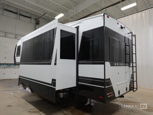 The thoughtful design extends to the bathroom, where you'll find a stylish 30 x 42 shower with a sleek plastic/glass enclosure. Practicality meets luxury with the inclusion of a washer/dryer, ensuring you're always ready for the next adventure. Outside, the 19 ft. powered retractable awning provides a perfect shady retreat, while exterior speakers and a 12V fridge enhance your outdoor experience. With a robust cargo capacity and ample tank storage, the Brinkley Model Z 2670 is your gateway to exploring the open road in style. For more information, visit your nearest General RV dealership.