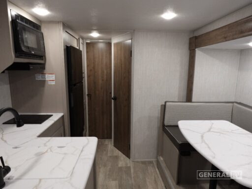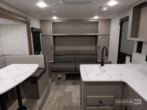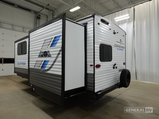 The well-appointed kitchen, centrally located, comes equipped with a three-burner cooktop and a mid-size electric refrigerator, ensuring you can prepare delicious meals on the go. The rear bath offers a convenient shower with a curtain, and ample storage throughout the trailer makes it easy to keep your living space organized. With a generous cargo capacity and a durable build, the Clipper 22BHSR is ready to take on any adventure you have in mind. For more details, visit your nearest General RV dealership and explore this fantastic model in person.