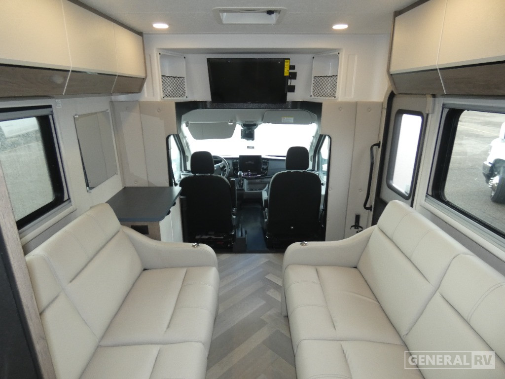 Inside, you'll find a well-appointed center kitchen equipped with a two-burner induction cooktop and a convection microwave, perfect for preparing your favorite meals on the go. The rear bath features a convenient 24x24 shower, providing a touch of luxury after a day of exploration. Enjoy the great outdoors under the 14-foot powered retractable awning, perfect for relaxing in the shade or dining al fresco. With a generous fresh water capacity of 25 gallons and ample storage, this RV is ready for your next adventure. Visit your nearest General RV dealership to explore this remarkable model in person and start your journey today.