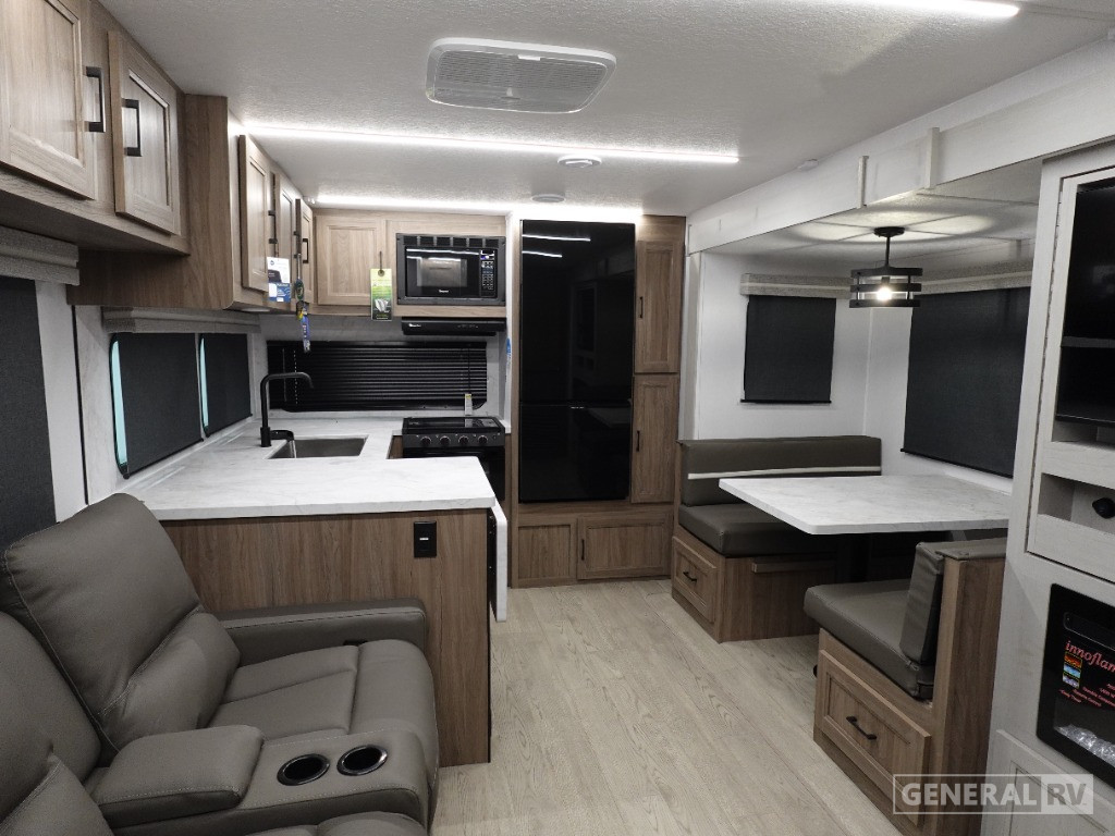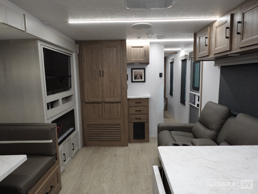 The center living area is thoughtfully designed for relaxation and entertainment, with a theater seat and a convertible sofa that ensures everyone has a place to unwind. The front bedroom boasts a luxurious queen bed with vaulted underbed storage, perfect for keeping your space tidy and organized. The center bath offers convenience with its 30" x 36" shower and linen storage. With a cargo capacity of 2,134 lbs, you’ll have no trouble bringing along all your gear for the journey. For those who love to cook outdoors, the pull-out camp kitchen is an added bonus, making this RV a true gem for adventurers. For more details, visit your nearest General RV dealership.