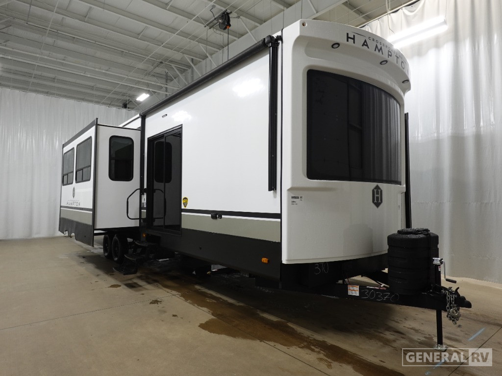 The 378DBB's thoughtful layout includes a center living area and two bathrooms, providing convenience and privacy for all. The rear and center baths feature modern plastic and glass showers, perfect for refreshing after a day of adventure. With ample storage throughout, including wardrobes and closets, you'll have plenty of space to keep your belongings organized. The RV is also prepped for a washer and dryer, adding to its residential appeal. Whether you're lounging under the 13 ft. powered retractable awning or enjoying the cozy interior, this Crossroads Hampton model promises an unparalleled RVing experience. For more details, visit your nearest General RV dealership today!