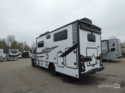 Sleeping arrangements are thoughtfully crafted with two twin beds that can convert into a king-size bed, alongside two bunks, comfortably accommodating up to four people. The wet bath is efficiently designed with a curtain for privacy. Outside, the 15.5 ft. powered retractable awning extends your living space into the great outdoors, perfect for enjoying a morning coffee or evening sunset. With a diesel engine offering 211 horsepower and 332 lb-ft of torque, the Condor 23S is as powerful as it is luxurious. Ready to explore more? Visit your nearest General RV Dealership to see this beauty in person and start your journey today!