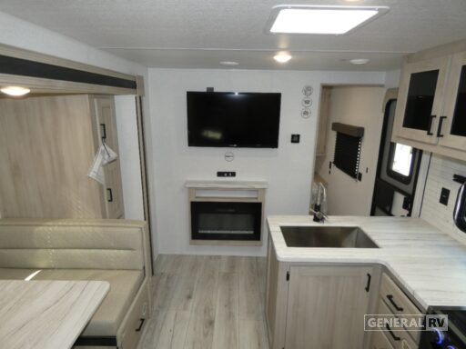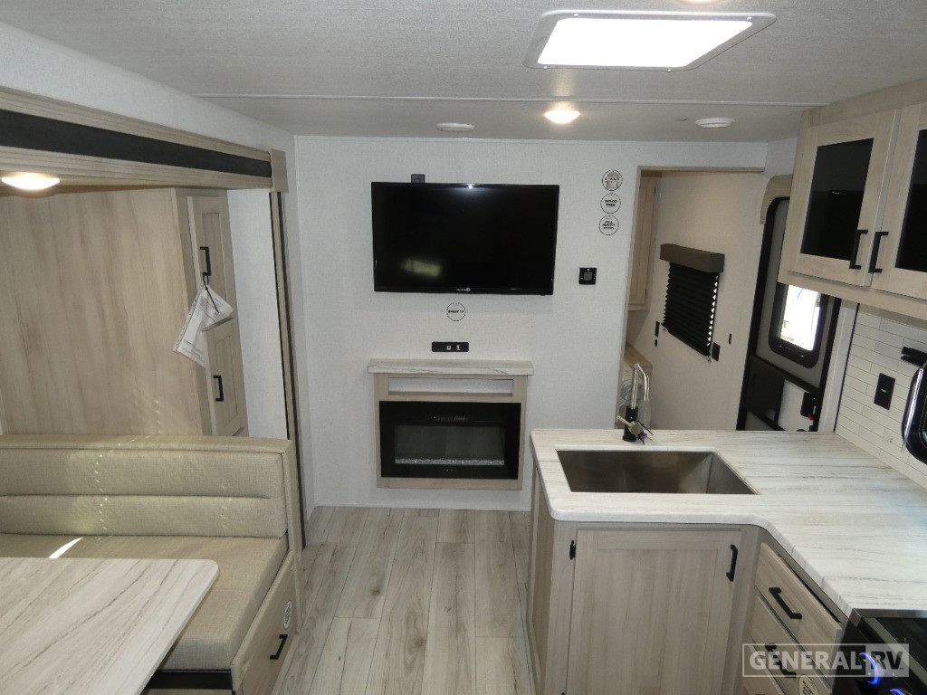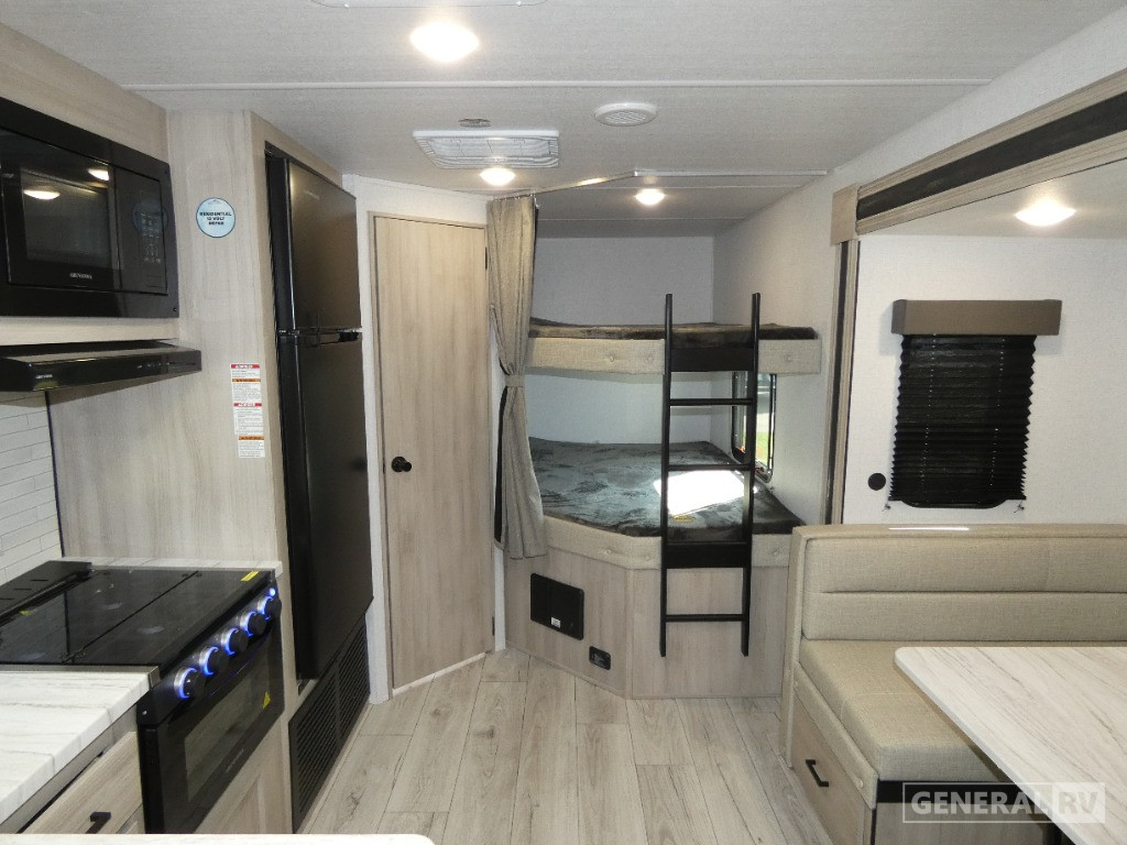 The Della Terra 241BH is crafted for convenience and relaxation. The rear bath, complete with a shower curtain, provides privacy and comfort. Outside, the 16-foot powered retractable awning creates a perfect shaded area for outdoor enjoyment. An outdoor kitchen with a fridge and pull-out griddle adds to the versatility, making it easy to entertain under the stars. With ample storage, including pass-through and exterior compartments, you can bring along all your essentials. The automatic heater ensures a cozy interior on cooler nights, making this RV a perfect companion for all your travels. For more details or to explore this model in person, visit your nearest General RV dealership.