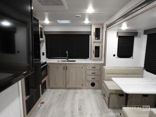 Retreat to the luxurious front bedroom, featuring a king-sized bed that promises restful nights under the stars. With two convertible sleeping areas, this RV accommodates up to six guests, ensuring everyone has a place to rest. The thoughtfully designed floorplan includes a center bath with a shower curtain, providing convenience and privacy. Outside, a 20-foot powered retractable awning extends your living space, creating the perfect spot for outdoor relaxation. With washer and dryer prep, abundant storage, and a robust fresh and gray water capacity, the Della Terra 263RK is your home away from home. For more details, visit your nearest General RV Dealership.