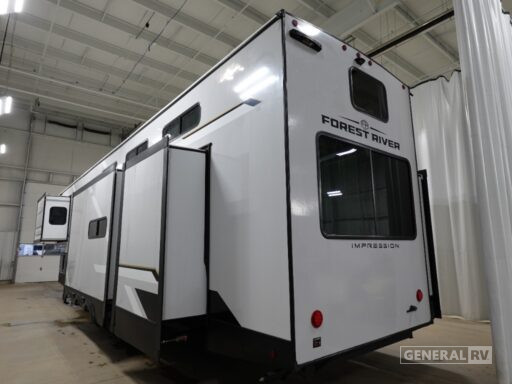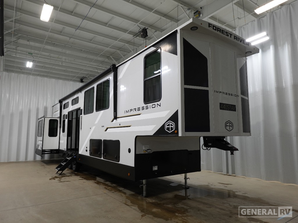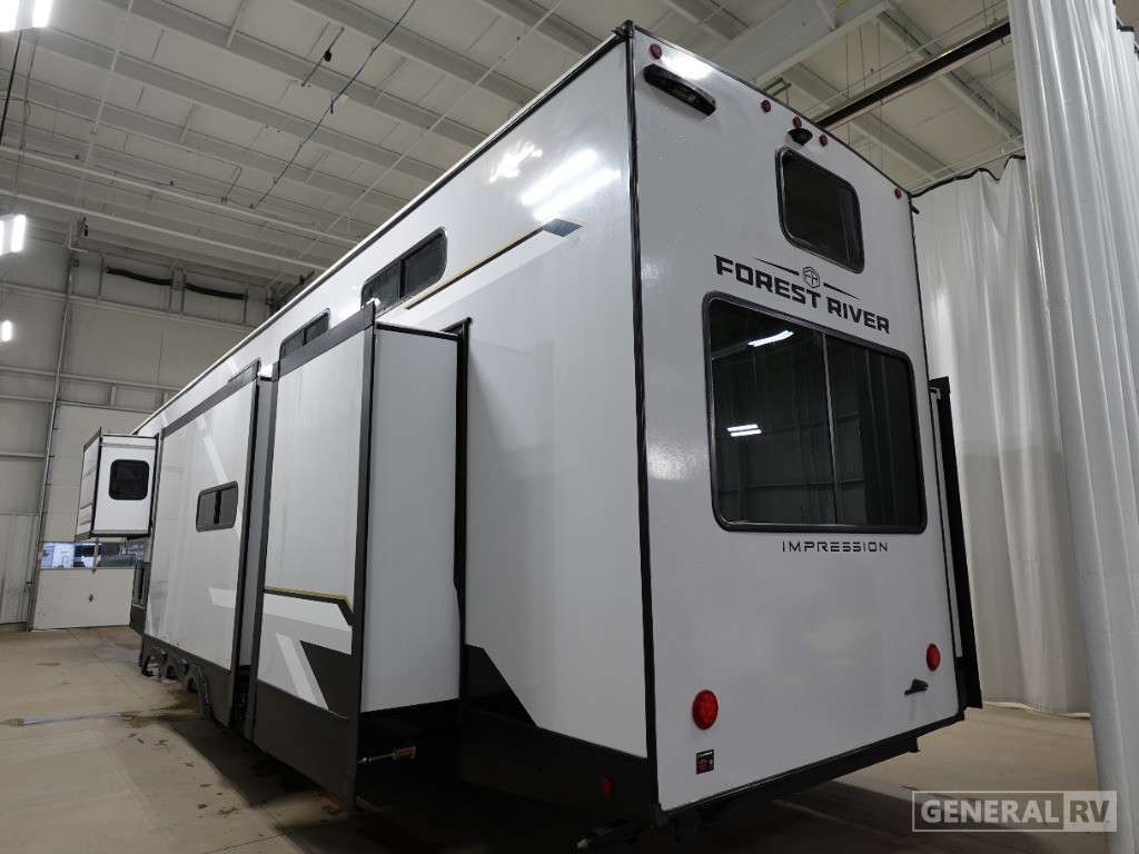 Experience the luxury of the 2025 Forest River Impression 44STAY, where comfort meets adventure. This spacious fifth wheel is designed for families and friends, accommodating up to five sleepers with a king-sized bed and a convertible option. The innovative floorplan features a cozy rear living area and a center kitchen equipped with a residential oven and range, perfect for creating culinary delights on the road. The triple-slide patio door opens to extend your living space outdoors under a generous 24 ft. powered retractable awning, ideal for enjoying the fresh air and scenic views.