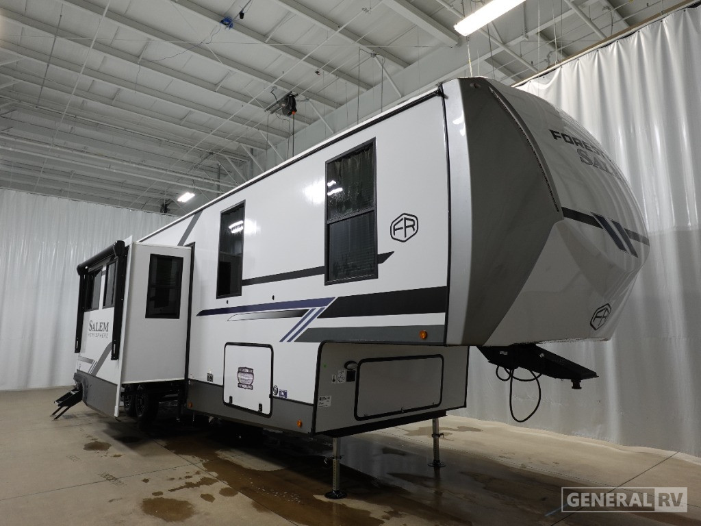 The Salem Hemisphere 375FAM is thoughtfully designed with convenience in mind. It comes prepped for a washer and dryer, ensuring you have all the comforts of home on the road. The 13 ft. powered retractable awning creates a perfect outdoor space for relaxation or entertaining. With a dry weight of 12,829 lbs and a cargo capacity of 2,671 lbs, this RV is ready to accompany you on countless adventures. Experience the perfect blend of luxury and practicality with this remarkable RV. For more details or to see it in person, visit your nearest General RV dealership.