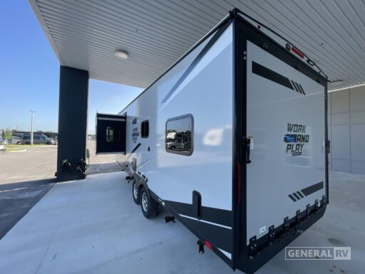 You can have the best of both worlds with this toy hauler; a little work and a little play! Once you unload your bikes from the ramp door, relax on the roll-over sofas while the chef of your group prepares lunch on the three burner cooktop. There are also two Euro recliners and an entertainment center that will make it feel more like home. The dual entry bath will create a master suite you are sure to love. Here, you will sleep soundly on the queen bed slide out, and there is a dresser to store your clothes for the week. It's time to load up and head out! Each Work and Play toy hauler by Forest River is built tough with a mega rail powder coated chassis, a one-piece Tufflex PVC roof membrane, and a fiberglass front cap with rock guard. You will find many convenient features, such as a Winegard Air 360 and TV antenna, an outside spray port, and slam latch door catches to store your riding gear. These toy haulers also include hidden hinge cabinets and doors, USB charging ports in multiple locations, a tankless water heater, plus many more amenities!