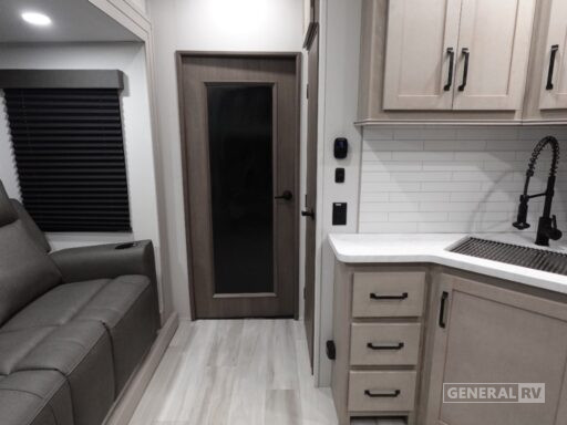Inside, the center kitchen and living area offer a seamless flow, featuring a mid-size refrigerator powered by electric or propane, and a three-burner cooktop that invites culinary creativity. The theater seating provides a perfect spot to relax, while the full-size and queen beds ensure a restful night’s sleep for up to six guests. The front bedroom offers privacy and tranquility, with ample storage for all your essentials. With an 18-foot powered retractable awning, you can enjoy the great outdoors in style, making every destination feel like home.