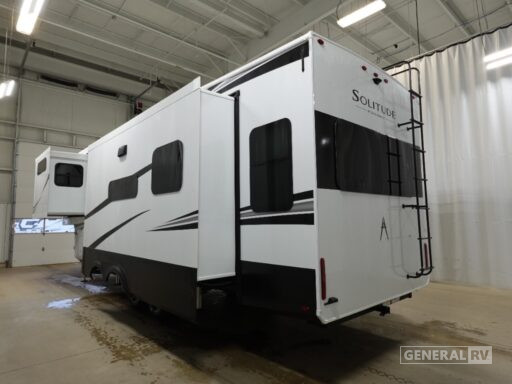 The Solitude 310GK is thoughtfully designed with a front bedroom that promises restful nights on a queen or optional king bed. The center bath offers convenience and privacy, complete with a sleek shower. With washer and dryer prep, staying fresh on the road has never been easier. The ample pass-through storage and optional pull-out kitchen enhance your outdoor living experience. With a cargo capacity of 2900 pounds and a GVWR of 15,000 pounds, this RV is as functional as it is beautiful. For more details and to see this model in person, visit your nearest General RV dealership.