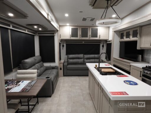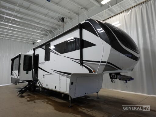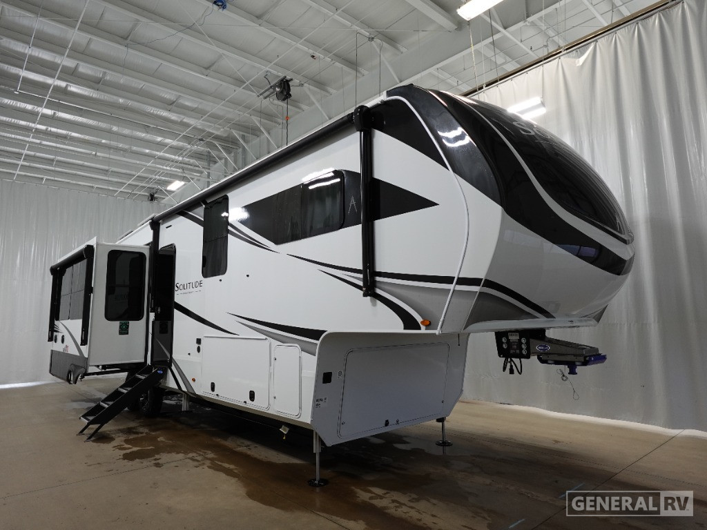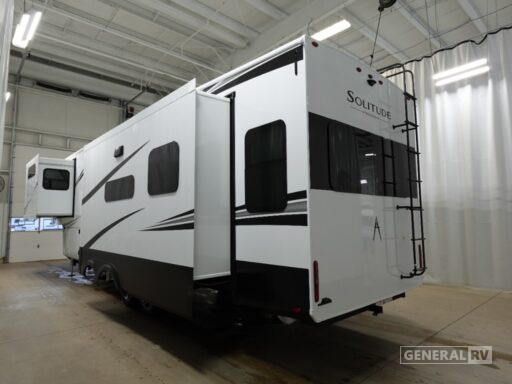 With an 81-gallon fresh water capacity and generous gray and black tank sizes, the Solitude 370DV is built for extended stays. The dual powered retractable awnings provide ample outdoor space to enjoy the fresh air, while the automatic heater keeps you warm on cooler nights. Visit your nearest General RV dealership to explore this masterpiece in person and start your journey in style.