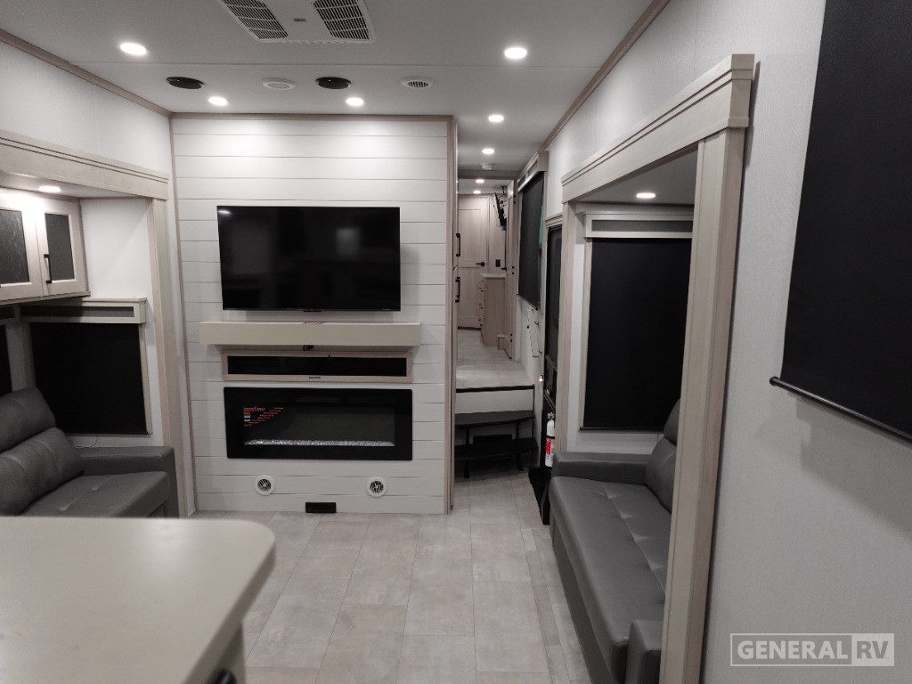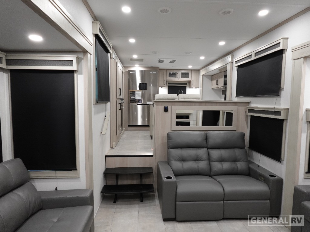 Experience the pinnacle of luxury and comfort with the 2025 Grand Design Solitude 390RK. This spacious fifth wheel, measuring an impressive 42.5 feet in length, is your perfect home on wheels, designed to accommodate up to six guests comfortably. The heart of this RV is its stunning rear kitchen, complete with a full-size refrigerator and a four-burner cooktop, making it a culinary enthusiast's dream. The open layout seamlessly flows into the center living area, where two tri-fold sofas and theater seating offer ample space for relaxation and entertainment.