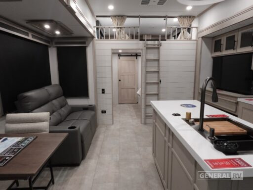 This model is thoughtfully designed with five slides to maximize space, creating an open and airy atmosphere. The two powered retractable awnings extend your living space outdoors, providing a perfect setting for alfresco dining or simply enjoying the scenery. With a robust fresh, gray, and black water capacity, along with washer/dryer prep, extended stays are as convenient as they are enjoyable. Whether you're parked by a serene lake or exploring the open road, the Solitude 391DL offers a sanctuary of comfort and style. For more details, visit your nearest General RV dealership.