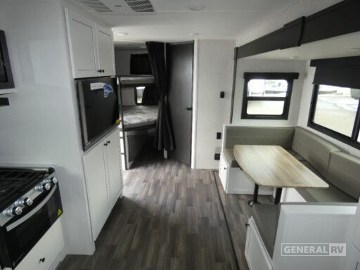 Step into the world of adventure with the 2025 Highland Ridge Range Lite 241BH, where comfort meets functionality in a stylish package. This RV is designed to accommodate up to eight sleepers, making it perfect for family getaways or trips with friends. The clever layout features a front queen bed, double bunk beds, and a convertible dinette, ensuring everyone has a cozy spot to rest. The center kitchen and living area offer a spacious environment for cooking and relaxation, while the full-size electric refrigerator and three-burner cooktop make meal prep a breeze.