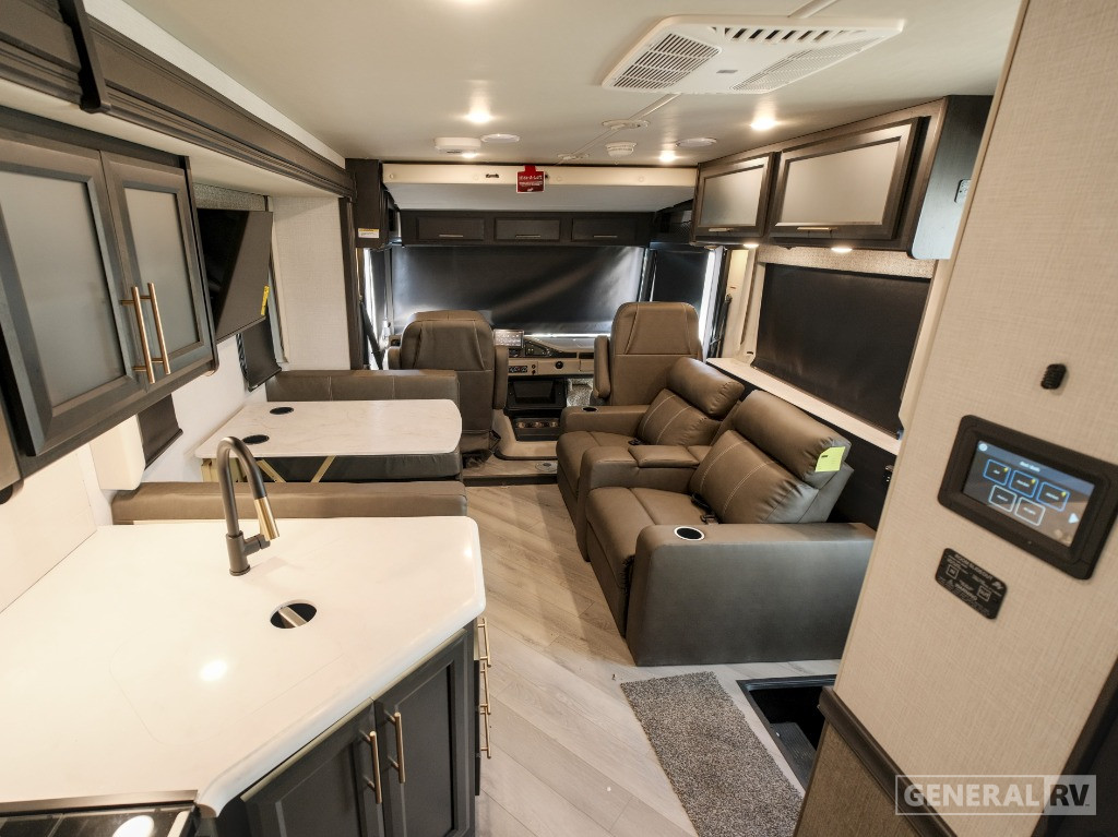 Step into the future of travel with the 2025 Holiday Rambler Eclipse 32S. This motorhome is designed for adventurers who crave both luxury and practicality. With its thoughtfully crafted floorplan, you'll find a spacious front living area that's perfect for entertaining. The hide-a-loft electric drop-down bed and jackknife sofa offer versatile sleeping options, ensuring comfort for up to eight guests. The center kitchen is well-equipped with a full-size electric refrigerator and a three-burner cooktop, making meal preparation a breeze. Imagine enjoying your meals at the dream dinette while taking in the panoramic views through large windows.