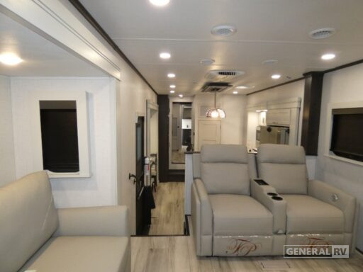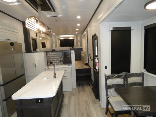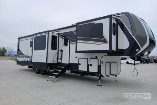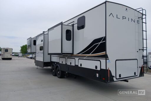 Retreat to the rear where the master suite awaits, complete with a king-sized bed offering ultimate relaxation. The cleverly designed bathroom, conveniently located nearby, provides modern amenities and a washer/dryer prep area for added convenience. With five slides, two powered retractable awnings, and a generous fresh water capacity, this Alpine model ensures every journey is met with style and ease. For more details or to see it in person, visit your nearest General RV dealership.