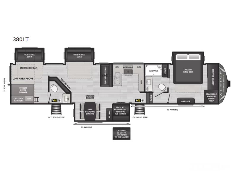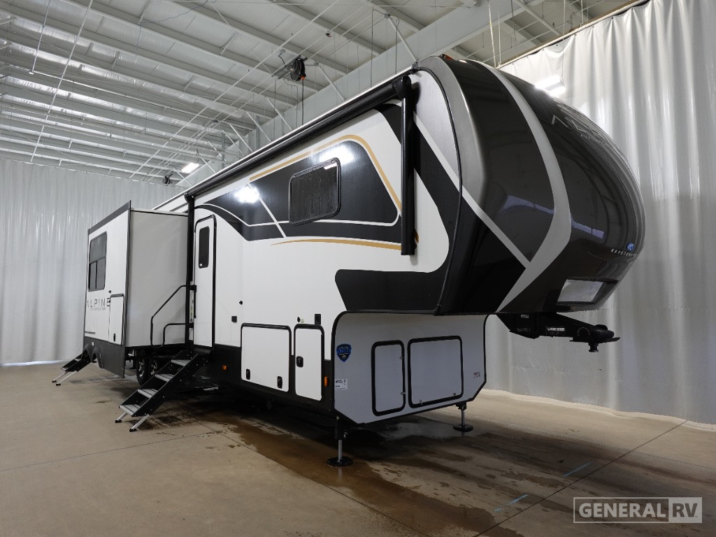 The thoughtfully designed floorplan includes a center living area that invites relaxation and entertainment, while the loft area provides additional sleeping or storage space. The master bedroom, equipped with a king bed and ample closet space, ensures restful nights on the road. Plus, the unit is prepped for a washer and dryer, adding a layer of convenience for extended stays. With a robust fresh water capacity of 75 gallons and generous gray and black water tanks, the Alpine 380LT is ready for your next big adventure. Visit your nearest General RV dealership to explore this exceptional model in person!