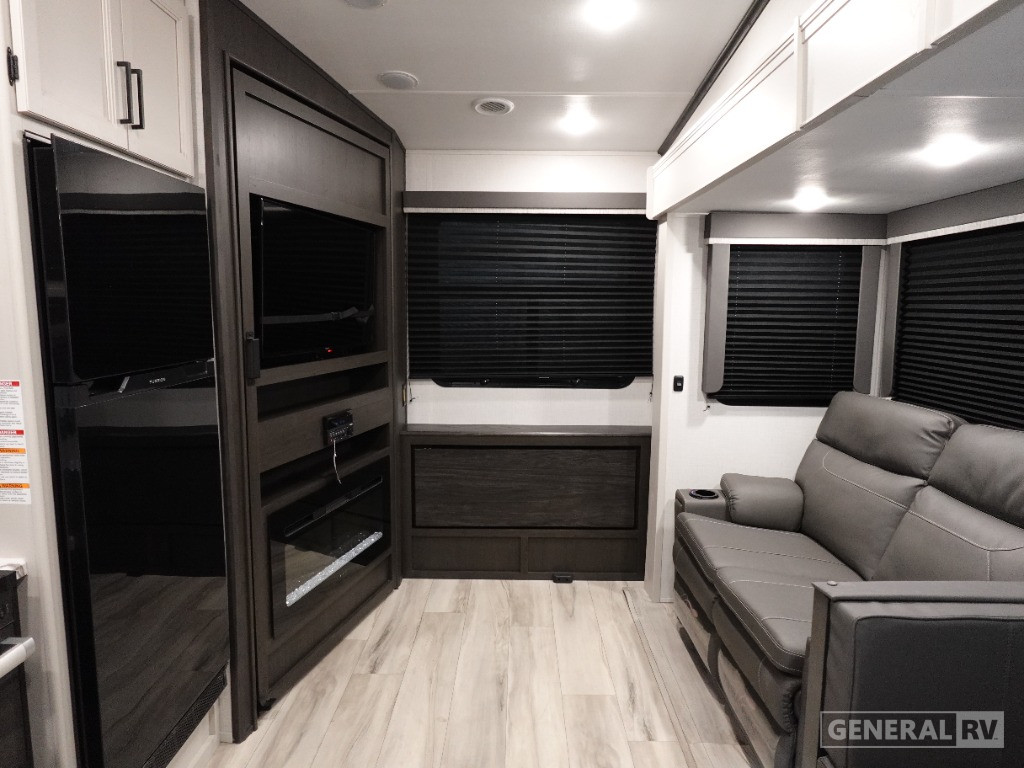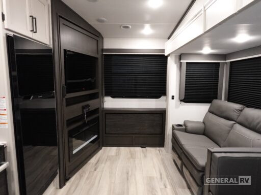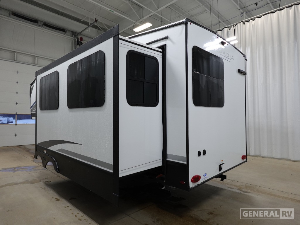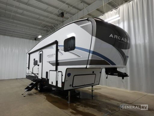 The front bedroom boasts a comfortable queen bed flanked by dual wardrobes, providing ample storage for all your travel essentials. The center bath is thoughtfully designed with a shower featuring a plastic and glass enclosure. Outside, the 17-foot powered retractable awning creates an ideal space for outdoor gatherings. With a substantial cargo capacity and a GVWR of 9500 pounds, this RV is as practical as it is elegant. Discover the freedom of the open road with the Arcadia Select 24SRE, and make every journey unforgettable. For more details, visit your nearest General RV dealership.