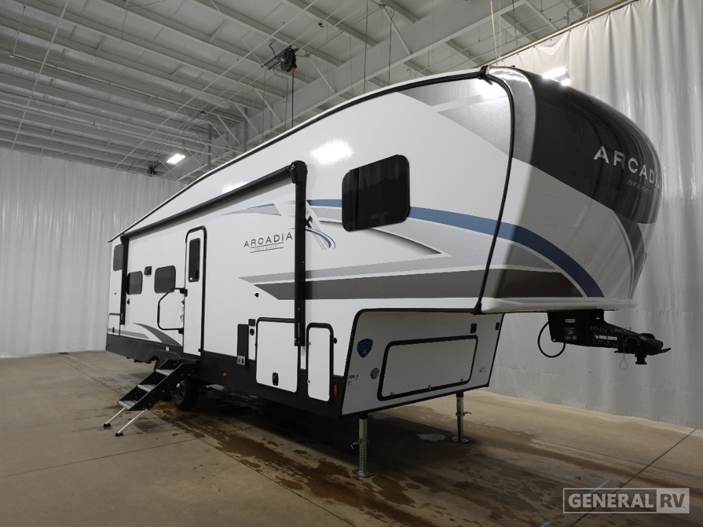The Arcadia Select 27SBH boasts a central kitchen equipped with a full-size electric refrigerator and a three-burner cooktop, making meal prep a breeze. The center living area, complemented by a dinette and a tri-fold sleeper sofa, offers ample room for family gatherings or leisurely evenings. Step outside to enjoy the 20 ft. powered retractable awning, perfect for outdoor relaxation or dining al fresco. With a sleek design and practical features, including a center bath and front bedroom, this RV ensures a seamless blend of style and functionality.