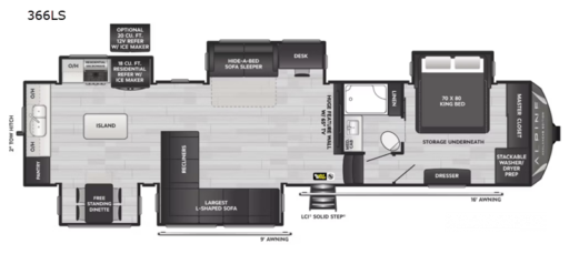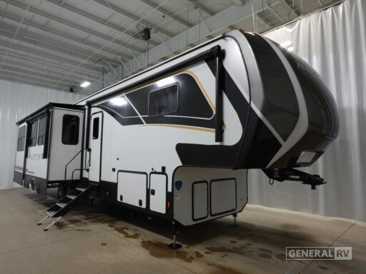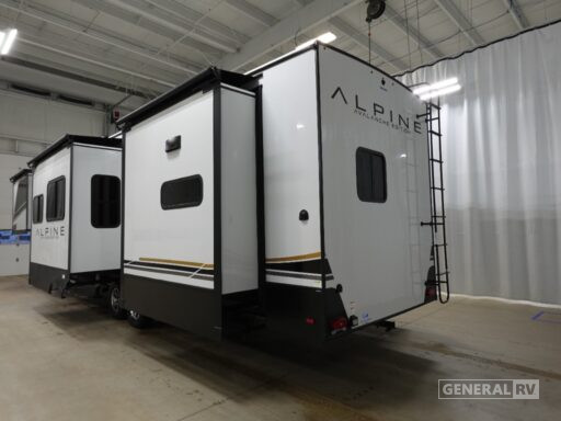 The front bedroom is a sanctuary of rest, boasting a king-sized bed with storage underneath and a master closet that’s prepped for a washer and dryer. The center bath, with its stylish plastic and glass shower, ensures convenience and privacy. With five slides, this RV offers expansive living space, and the dual powered retractable awnings extend your outdoor enjoyment. Whether you're embarking on a weekend getaway or a cross-country journey, the Alpine 366LS promises an unforgettable experience. For more details and to see this beauty in person, visit your nearest General RV dealership.