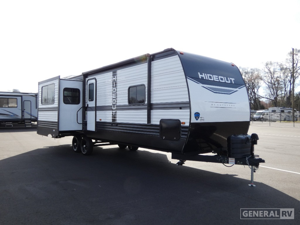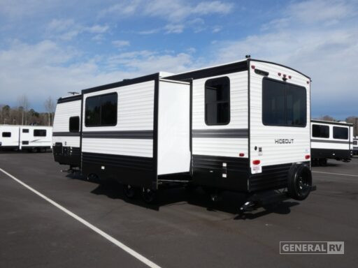 Retreat to the front bedroom, where a queen bed promises restful nights. Clever storage solutions, including dual linen closets and a handy laundry chute, keep everything organized and within reach. The center bath, equipped with a shower curtain, ensures privacy and convenience. With a GVWR of 9575 lbs and a cargo capacity of 2351 lbs, this RV is both robust and versatile, ready to accompany you on your adventures. Whether you're a seasoned traveler or a weekend warrior, the Hideout 28RKD is your ticket to unforgettable journeys. For more details, visit your nearest General RV Dealership.
