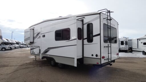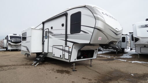 As you move towards the front, you'll find a cozy bedroom with a queen bed, ample wardrobe space, and nightstands, ensuring a restful night's sleep. The center bath offers convenience with its plastic/glass shower and linen storage. With a 10 ft. powered retractable awning, you can enjoy the great outdoors while being shaded from the sun. The Cougar Half-Ton 27SGS, with its impressive cargo capacity and sleek design, is ready to accompany you on all your journeys. For more details, visit your nearest General RV dealership.