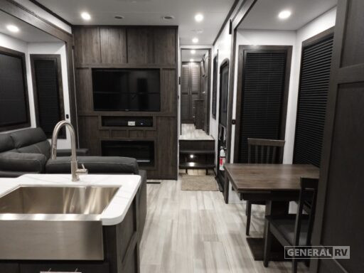 Relax in the plush theater seating or the cozy L-shaped sofa while enjoying the view from the large windows. The front king bed suite promises a restful night's sleep, while additional sleeping arrangements include a queen bed and convertible options, comfortably accommodating up to seven guests. The 13-foot garage area is perfect for storing your toys, and the dual 30-gallon fuel tanks ensure you're ready for any adventure. With three powered retractable awnings providing ample shade, and washer/dryer prep for added convenience, the Fuzion 432 is your gateway to a luxurious and adventurous lifestyle. Discover more at your nearest General RV dealership and start your journey today!