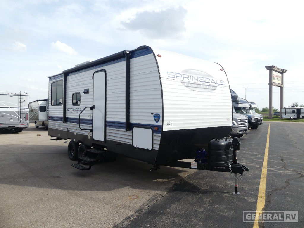 The center kitchen is equipped to handle all your culinary needs with a three-burner cooktop and a full-size electric refrigerator, ensuring you can whip up delicious meals with ease. The center bath, complete with a shower curtain, provides a private space for refreshing yourself. Enjoy the outdoors under the 12 ft. powered retractable awning, perfect for shaded relaxation or entertaining guests. With thoughtful design and quality construction, the Springdale Classic 200RLC is ready to elevate your travel experiences.