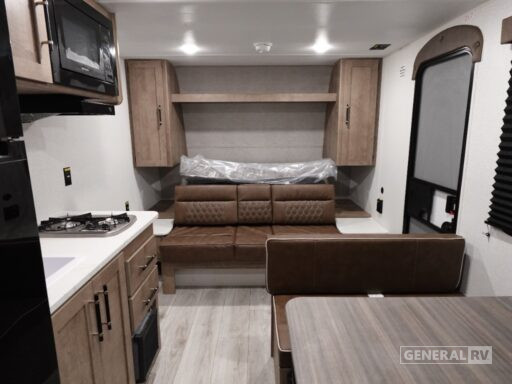 This cute Springdale Classic Mini bunk model will easily sleep seven with the double-size bunks, booth dinette, and queen Murphy bed which features a fold-down sofa at the end. During the daytime, you can have the seating you need and want, and at night the sofa folds to become part of the front bed. The rear corner bath is convenient and features a tub, toilet, and sink. The kitchen is fully equipped to allow you to cook as you travel, and you can enjoy meals while under the 15' power awning.