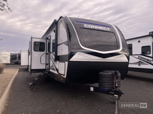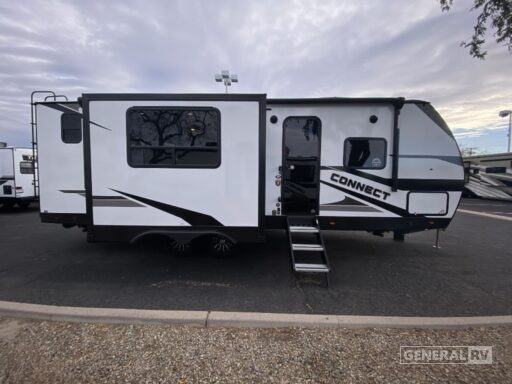 The Connect 252BH is as functional as it is stylish, featuring a rear bath with a convenient plastic and glass shower. The thoughtful design includes ample storage options, such as pass-thru storage and a trunk door, making it easy to bring along all your travel essentials. With a 19-foot powered retractable awning, you can extend your living space outdoors, providing shade and comfort as you enjoy the great outdoors. This model's lightweight design, combined with its robust construction, makes it an ideal choice for both new and seasoned RV enthusiasts. For more details or to see this model in person, visit your nearest General RV dealership.