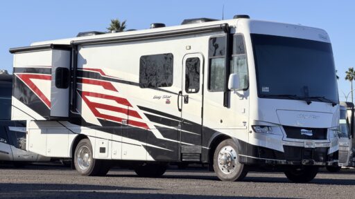 As you move towards the rear, the private bedroom offers a serene retreat with a plush queen bed and ample storage, including a shirt wardrobe and dresser. The center bath is conveniently located and features a plastic/glass shower, providing all the comforts of home. With a 19 ft. powered retractable awning, you can extend your living space outdoors and enjoy the scenery in style. Built on a robust Ford F53 chassis with a powerful 335 horsepower engine, the Bay Star 3014 ensures a smooth and reliable journey. Whether you're embarking on a short getaway or a cross-country adventure, this RV is ready to make your travels unforgettable. For more details, visit your nearest General RV dealership.