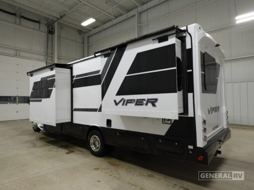 The Viper 27V is designed for restful nights, featuring a cozy rear bedroom with a queen bed and ample overhead storage. The convertible dinette provides additional sleeping space, accommodating up to four guests comfortably. The center bath with a shower curtain offers convenience and privacy. Enjoy the great outdoors under the powered retractable awning, perfect for alfresco dining or simply relaxing in the shade. With a 40-gallon fresh water capacity and a towing capacity of 7,500 pounds, this RV is ready for any adventure. For more details or to experience the Viper 27V firsthand, visit your nearest General RV dealership.